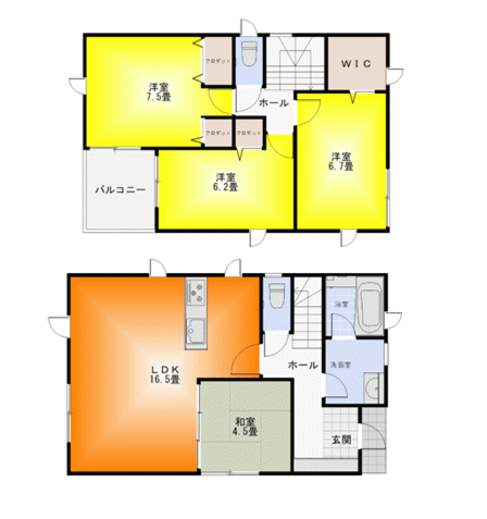 LDK:16.5、和:4.5、洋:7.5、6.7、6.2、WIC、浴室、洗面、トイレ